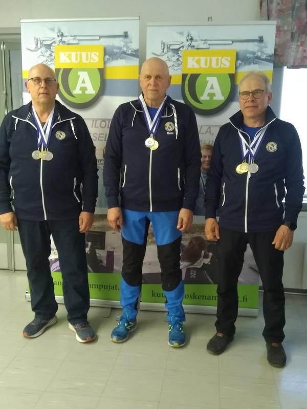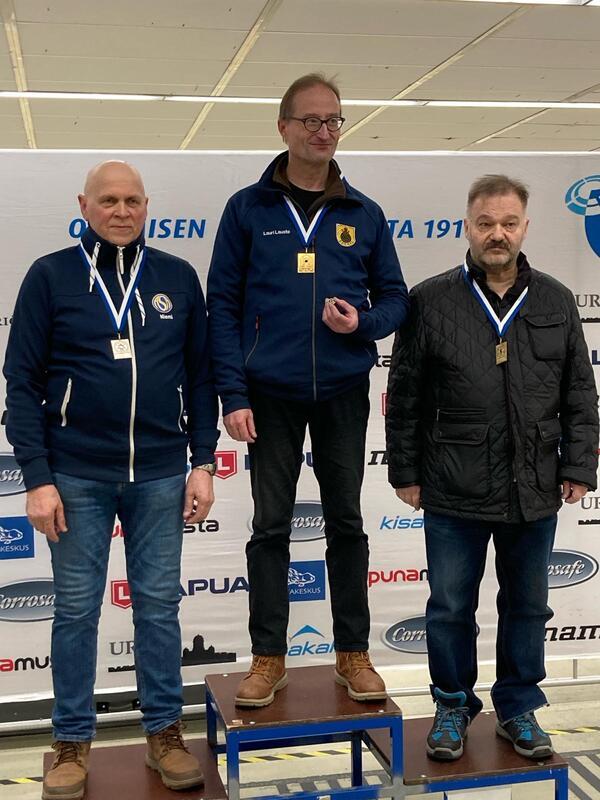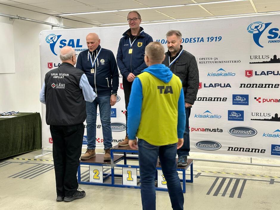 SM-KISAT TURKU 22.3.2024 ILMAKIVÄÄRI M60-SARJAN MITALIKOLMIKKO vas. MARKKU NIEMI, MESTARI LAURI LAUSTE ja JUKKA JOKINEN.