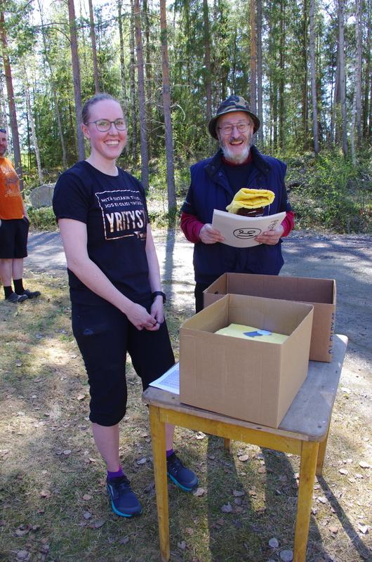 KISOJEN VANHIN OSALLISTUJA Y80-SARJAN VOITTAJA TAUNO TÖRNUDD POSEERAA PALKINTOJEN JAKAJAN ÄSA:n PUHEENJOHTAJAN HENNA KUOPPALAN KANSSA