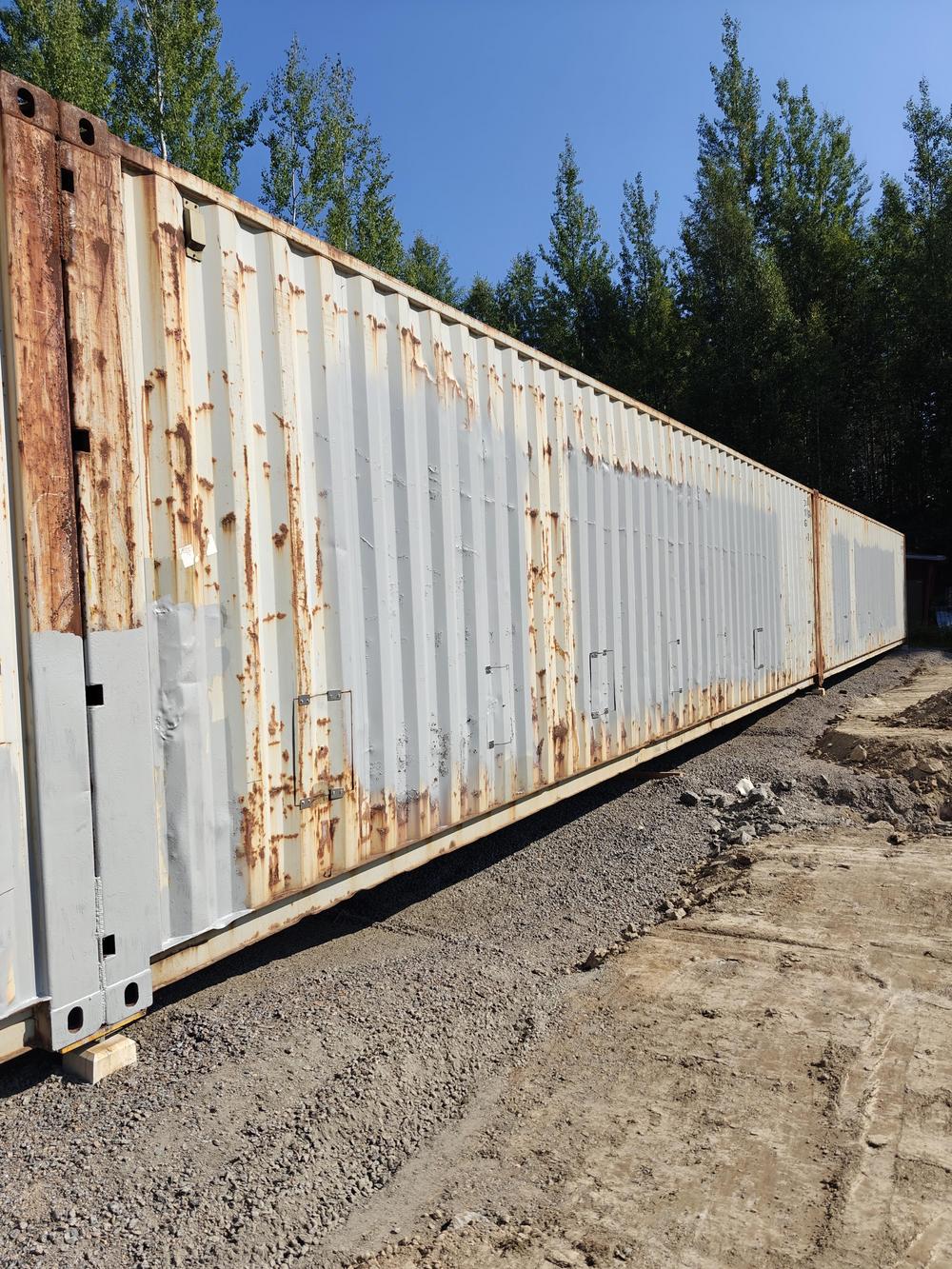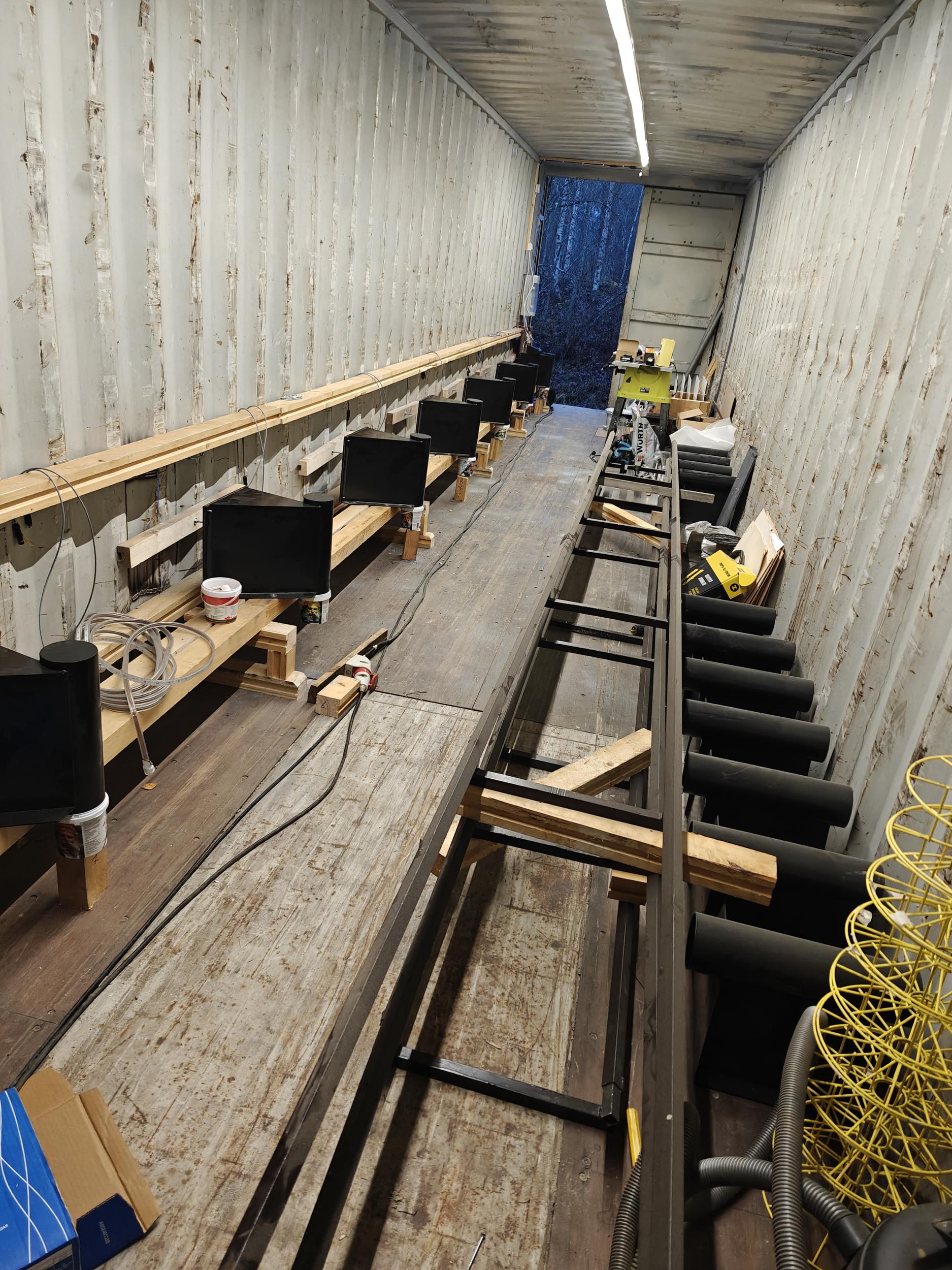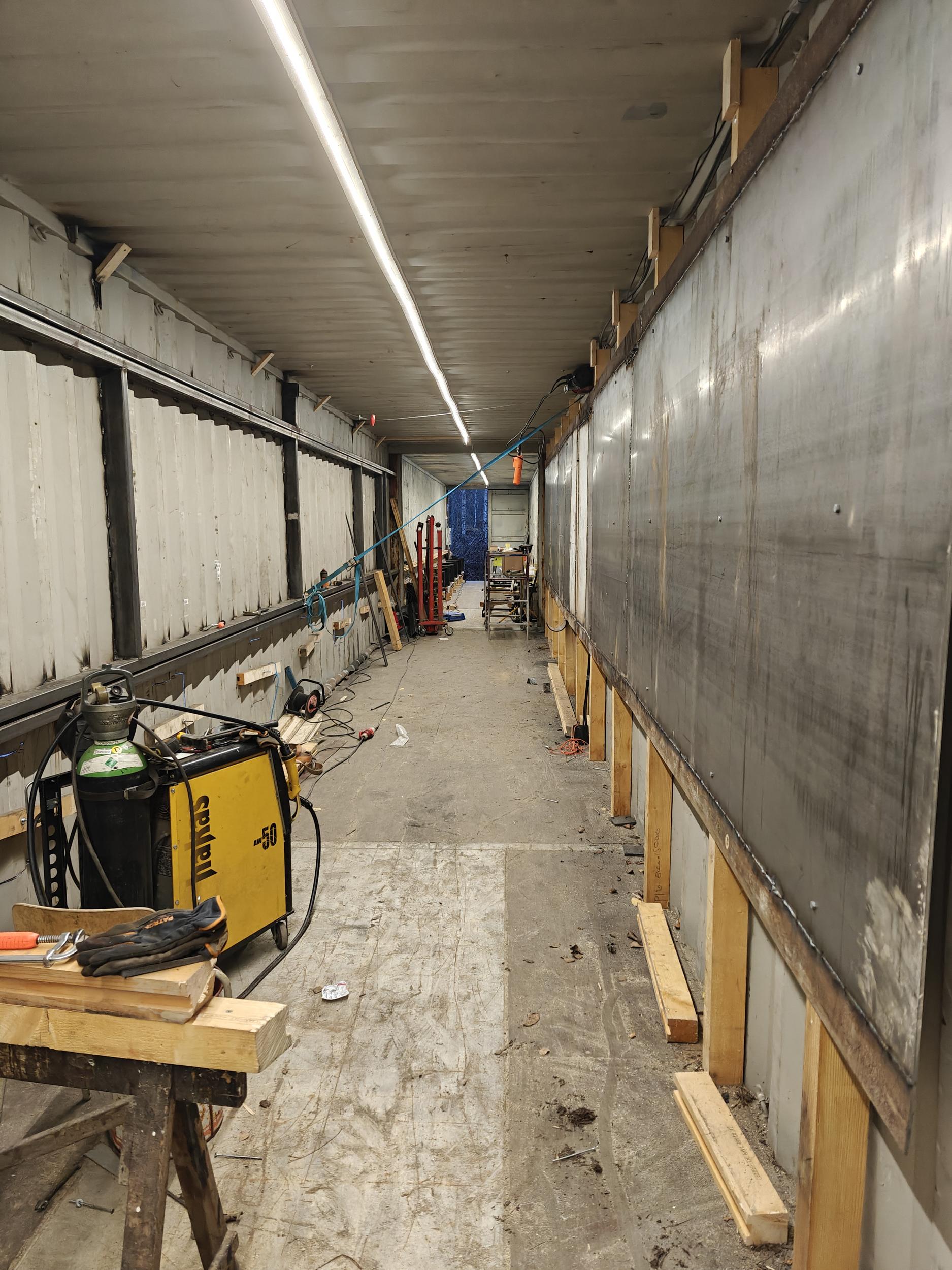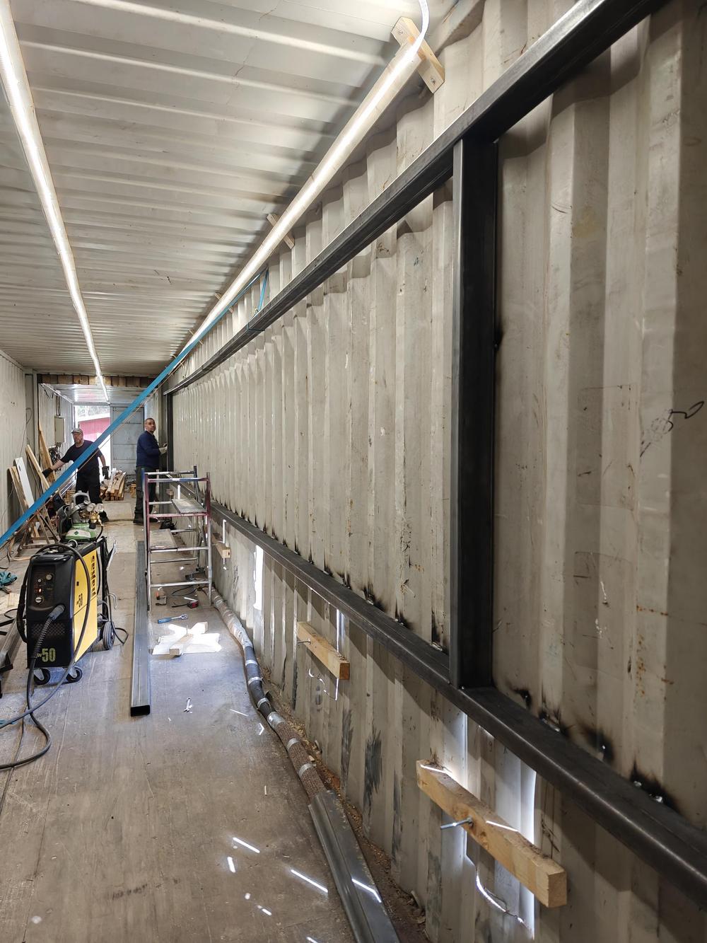 27.2.2025 saatiin myös merikontit Raumalta paikan päälle odottamaan työstämistä. Merikontteihin tehdään aukotukset taululaitteita varten ja poistetaan päätyjä niiden yhteen liittämistä varten.